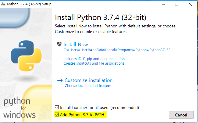 2. 하단에 add python 3.7 to path를 체크하기!!