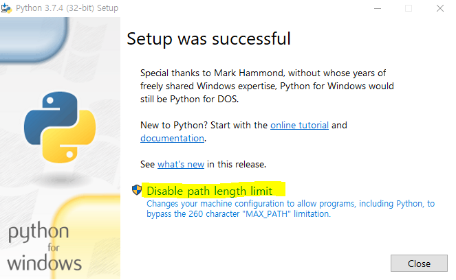 3. install 이 끝난 이후 disable path length limit 를 눌러줍니다.