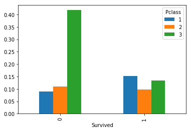 pd.crosstab(titanic_df.Survived, columns=titanic_df.Pclass,normalize=True).plot(kind='bar') # 막대 그래프