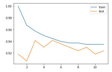 # 리스트 형태로 1~ 11까지의 train, test 정확도 그래프