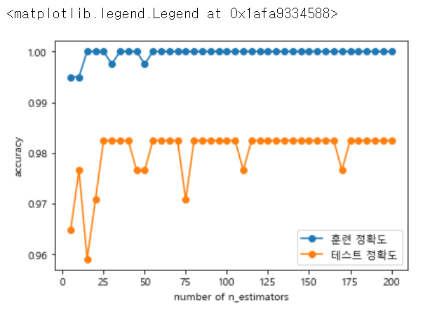 위의 그래프를 보면 test 정확도가 25일때 가장 최대이며, 더 이상 높아지지 않다는 것을 추정하면 n_estimators = 25로 지정할 수 있습니다.