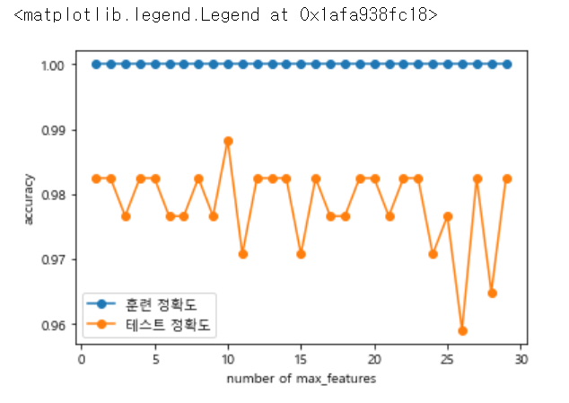 위 그래프에서 test가 제일 높을 때 max_features의 값은 10인 것을 확인할 수 있습니다.