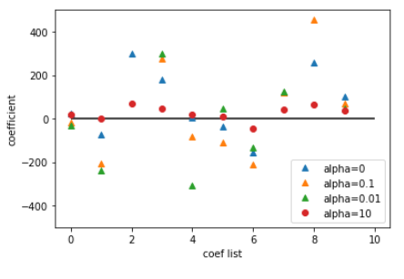 alpha는 클 수록 규제가 많이 들어가며, 복잡해진다. 또한, 커질수록 계수의 크기가 줄어들게 되며, 영향을 끼치는 변수가 줄어들게 됩니다.(alpha = 10을 보면 확인 가능)