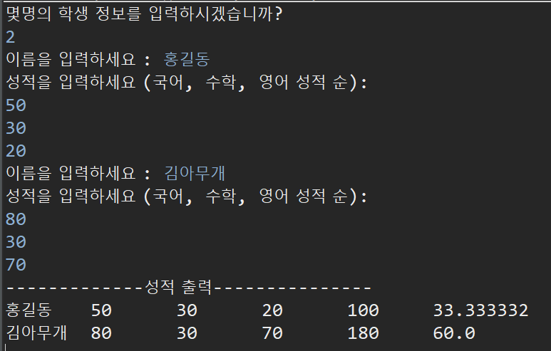 String name; //이름 int []score; //점수(국어, 영어, 수학, 총점) float avg; //평균