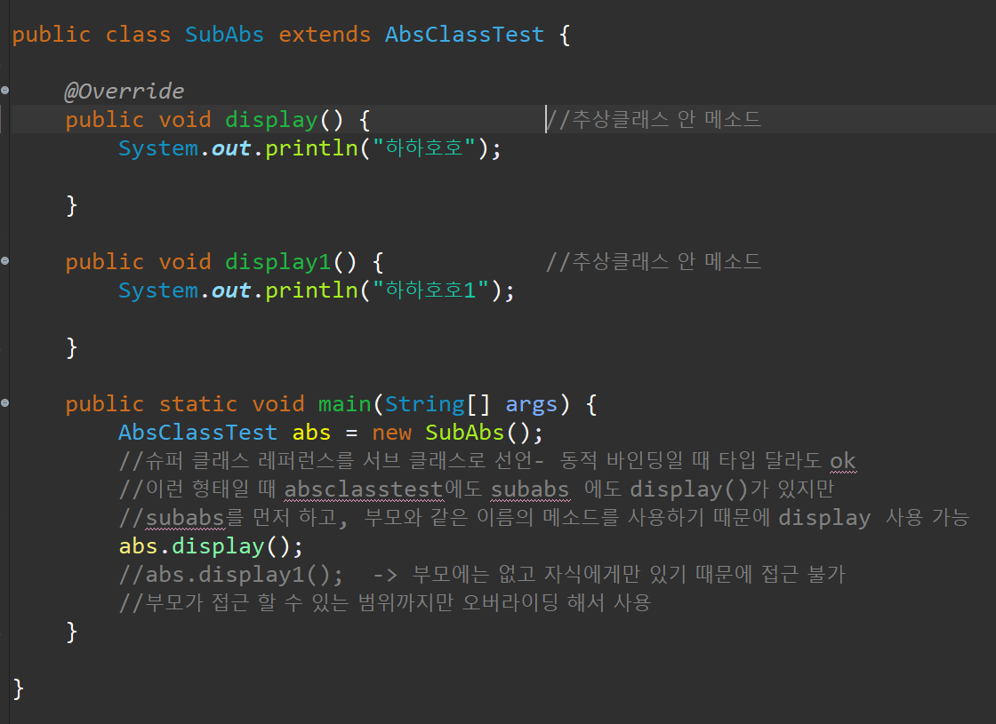 - 강제성 부여하기 때문에 서브 클래스는 추상 메소드를 꼭 오버라이드 해야함