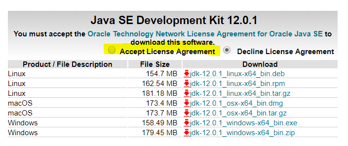 3. 설치 전 동의해야 다운로드 가능하기 때문에 Accept License Agreement를 선택하고 해당 운영체제에 맞는 파일 다운로드하면 됩니다.