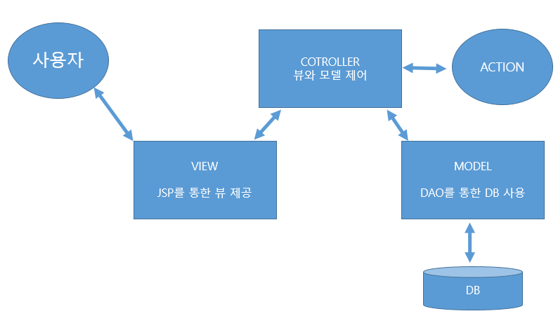 - 사용자의 요청을 JSP에서 처리하며, JAVA BEAN을 통해 작업 처리