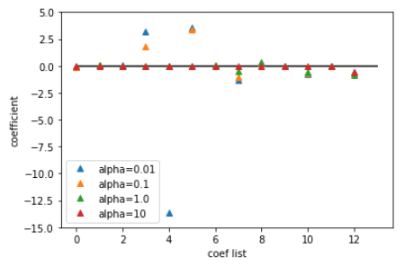 - 그래프를 확인해보면 0의 값을 가진 것을 확인 할 수 있다. 이것이 Ridge와의 차이점이다.