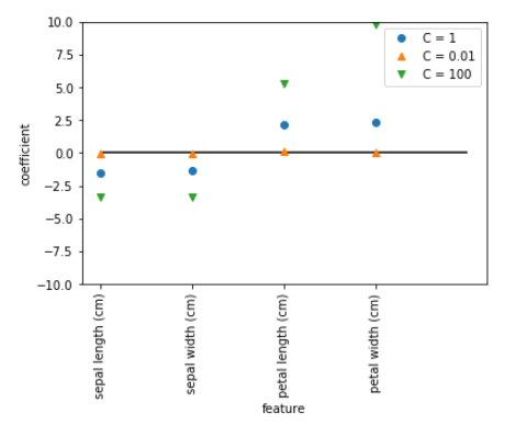 - 그래프 결과가 0에 가까울 수록 규제가 강함 -> C값이 작을 수록 훈련 덜 복잡해서 강한 규제 (C = 0.01)