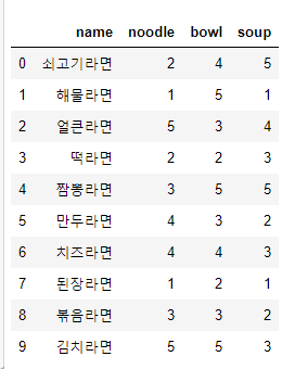- 데이터 프레임으로 변경하면 위와 같은 표가 나오게 된다. (면, 그릇, 국물에 대한 수치)