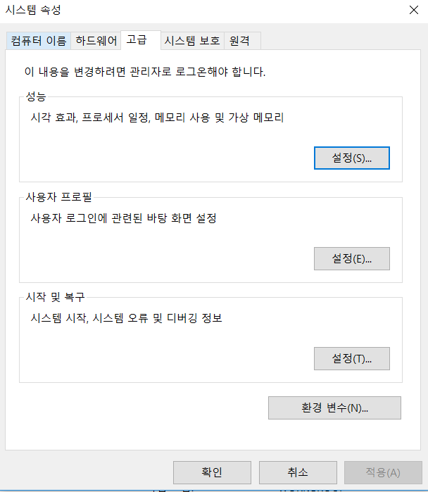 시작 -> 제어판 -> 시스템 -> 고급 시스템 설정